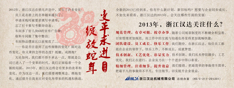 2013年,浙江漢達將從規范管理、團隊建設、技術創新、精細管理四個方面著力,目的在于為客戶提供更具價值的產品、更貼心的服務,為員工提供更好的發展平臺、更多可能性的未來。