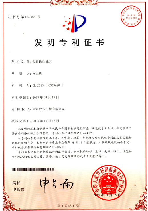 1月7日,公司首個(gè)發(fā)明專(zhuān)利“多軸鉆攻機(jī)床”證書(shū)到手