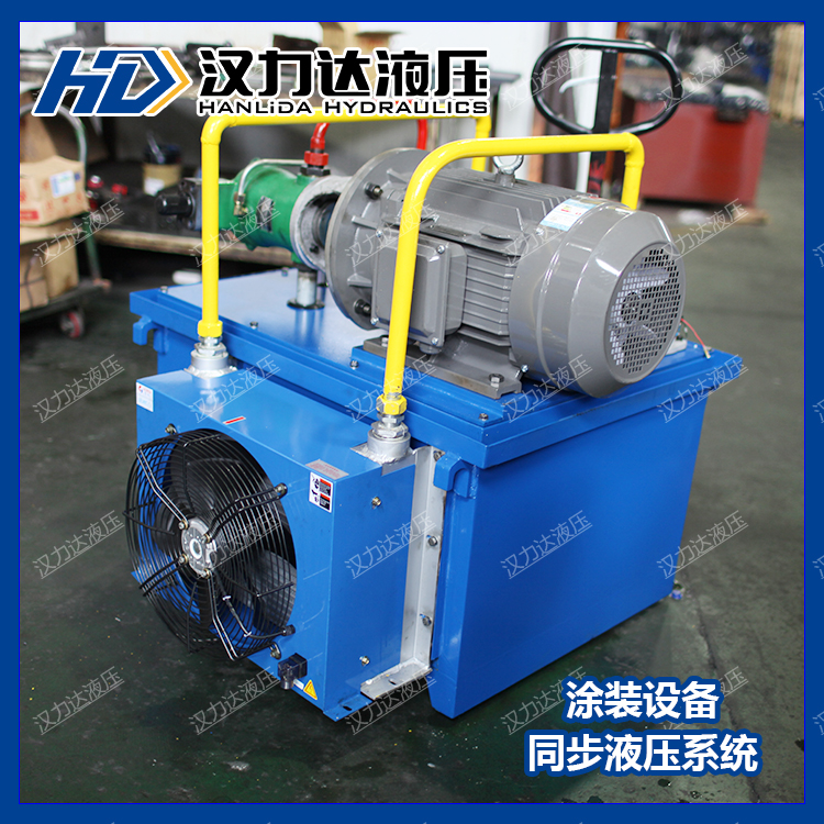 輸送設備同步液壓系統控制一個油缸,推力要求3噸,電機2.2KW,油缸推出全程時間是6秒左右,中位可停,速度可調,保壓,加風冷卻器。