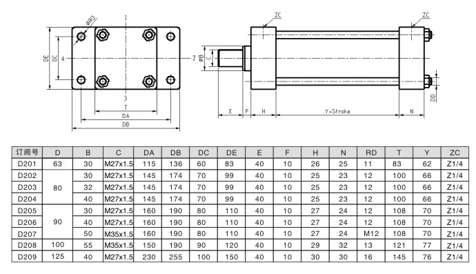 前法蘭安裝-低壓拉桿液壓缸尺寸圖及參數